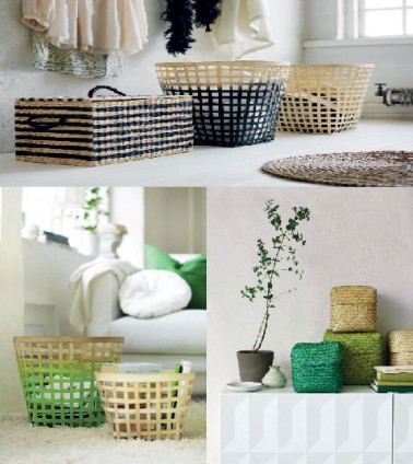 La boîte de rangement en jacinthe d’eau et deux paniers en bambou noir et naturel ( haut) Le panier vert et la corbeille naturel en bambou ( gauche) Les boîtes en jonc de mer de divers coloris ( droite) Nipprig d’Ikea