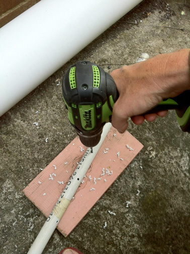 La première étape pour commencer à fabriquer votre jardin suspendu pour fraisiers, c'est de faire des gros trous dans le tube PCV avec une perceuse à embout scie cloche.