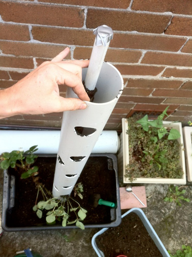 Pour finir, mettez le petit tuyau dans le gros tube et plantez le tout de manière solide dans la terre. Mettez, en partant du bas, des plants de fraises dans les gros trous et comblez au fur et à mesure avec du terreau jusqu’en haut.
