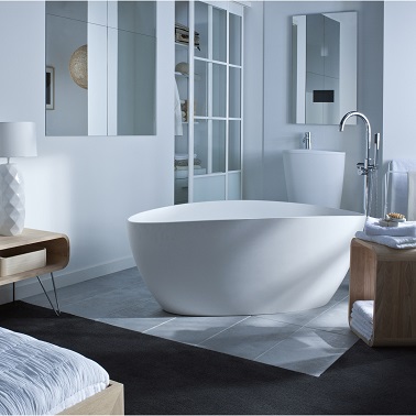 Une baignoire îlot géométrique et raffinée aux accents zen pour proposer un vrai lieu de relaxation dans la salle de bain ©Castorama