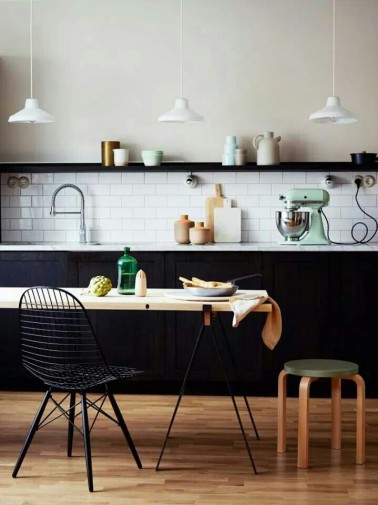 Le vintage a décidément la côte ! Cette cuisine scandinave en a d’ailleurs fait un allié de poids dans la déco. Le vert d’eau s’invite par petite touche entre l’indémodable duo noir et blanc et vient même s’accorder avec le bois. En crédence cuisine, le carrelage métro exprime son effet lumière posé entre les meubles et l’étagère d’un noir profond. Une chaise grillage noire en fer côtoie un tabouret bois assise vert d’eau autour d’une table tréteaux au style industriel. Une ambiance particulière règne dans cette cuisine aux accents old school rétro . Un mélange de styles et d’époque détonnant mais pile dans l’ère du temps ! Source : interiorjunkie.com