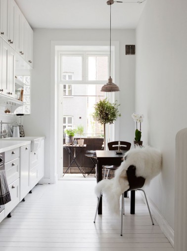 N’en déplaise aux grandes étendues de terres nordiques, la déco de la cuisine scandinave ne concerne pas que les grands espaces ! La preuve avec cette cuisine étroite épurée au design minimaliste. Une ambiance pure et paisible se dégage de cette cuisine qui semble s’être couverte d’un manteau de neige. Cependant, la blancheur quasi-absolue de la pièce est rythmée par la petite table de cuisine et ses chaises noires donnant l’impression d’une superficie optimale. Comme quoi le design scandinave a beaucoup d’autres avantages que le seul esthétisme ! Source : Cocolapinedesign.