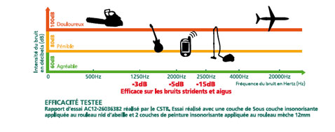 L’efficacité de ce système anti bruit a été testée par le cstb (Centre Scientifique du Bâtiment) Ce test a montré une diminution de -3db et jusqu’à -15 dB selon les fréquences. Les gains sont particulièrement spectaculaires sur les sons stridents et aigus de forte fréquence sonore comme les alarmes, les cris, la musique, les sonneries, les bruits de rue… Fréquences entre 2000HZ ET 2500H.