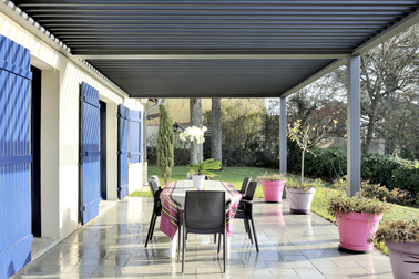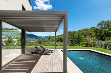 La pergola bioclimatique connectée s’ouvre sur le jardin