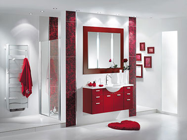L’effet inverse fonctionne aussi à merveille quand des touches de rouge viennent éveiller un espace blanc. Vous pouvez opter pour ce type de meuble de rangement / vasque rouge. Si vous ne disposez pas d’un meuble de salle de bain rouge vous pouvez toujours compter sur les tapis et les serviettes de bain. Meubles de Salle de bain disponible chez Mobalpa.