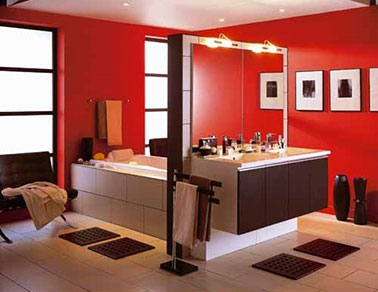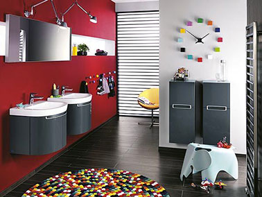 La décoration d'une salle de bain aime la couleur rouge pour son effet dynamisant. Avec un mur rouge, des meubles sous vasque gris anthracte, quelques touches de couleurs flashy ne gâche rien !
