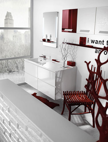 Une chaise, une étagère rouge et hop la salle de bain blanche se transforme en un espace design. Meubles et vasque Espace Aubade