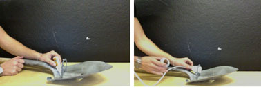 Fabriquer la plaque qui va servir à fixer la douille du kit suspension luminaire. dans une petite plaque d’acier découper une forme en V plus ou moins large selon le modèle de la pelle. Percer à l’aide d’une scie cloche un trou d’environ 4 à 4.5 cm dans lequel sera logée la douille. Faire une petite pliure sur la pointe du V. Vérifier que la douille s’insère facilement dans le trou et visser l’ampoule pour vérifier qu’elle ne touche pas la partie métallique de la pelle. Coller ensuite la plaque sur la pelle à l’aide d’une colle époxy spéciale fixation métal, par exemple Colle époxy métal de Sader.