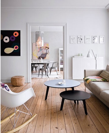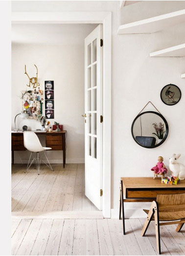 - Dans cet espace on mise sur l’unité de style pour ouvrir le salon sur le bureau. Reprenant le pur esprit de la déco scandinave, le parquet blanc, la peinture blanche nuancée mettent en avant l’aspect chaleureux des meubles en bois ciré.