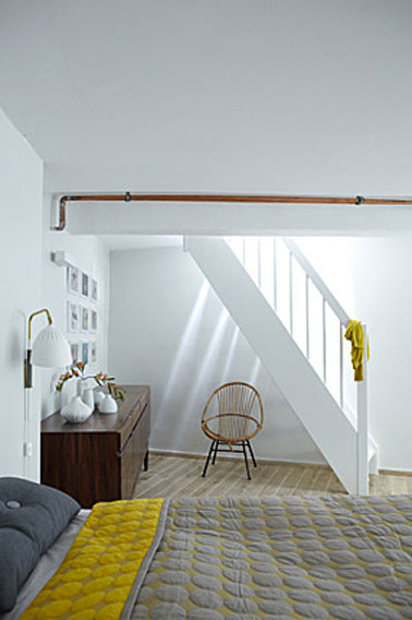 - Lorsque la chambre est en sous-sol , peindre les murs en blanc, mélanger meubles vintage et déco épurée, on crée une ambiance déco scandinave lumineuse et propice au repos.
