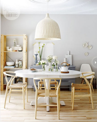 - Une déco de cuisine scandinave qui a tout pour mettre en appétit : Murs gris clair, table blanche, étagère en pin, quelques accessoires en déco murale …