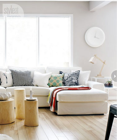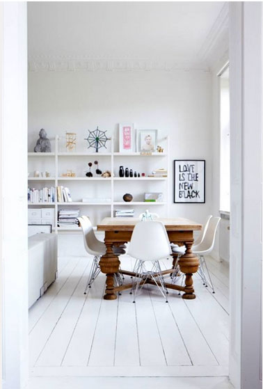 - Du blanc du sol au plafond dans un salon salle à manger dans le pur esprit déco scandinave où la table en chêne massif apporte une note chaleureuse.