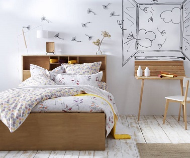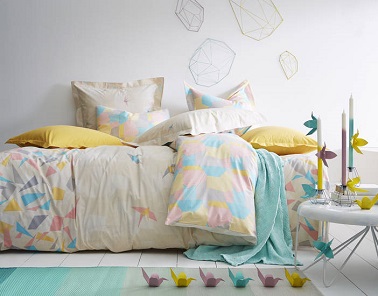 Des couleurs pastel, des formes géométriques, cette parure de lit adopte des motifs en forme d’origamis qui donnent un air frais à toute la chambre à coucher. Egayé par des coussins jaune pâle uni. Housse de couette 140×200 cm 58,50 € Drap motifs : 47 €, Taie d’oreiller origami : 19,50. Origami chez Essix.
