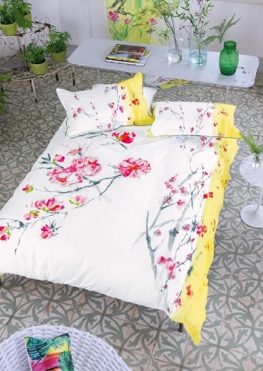Réalisée à l’aide d’une impression numérique, une parure le lit en satin de coton affiche de magnifiques dessins floraux colorés. Rappelant les délicats et précis coups de pinceaux des dessins orientaux cette parure est absolument fraîche et délicieuse à l’œil. On adore ! Housse de couette à partir de 118,50 €, Taie d’oreiller : 41€ . Oriental Flower Peony Designer Guild.