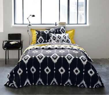 Une parure de lit aux motifs ethniques noir et blanc, une bonne idée déco tendance pour amener la chambre dans la modernité. Le duo chic de ces deux couleurs contrastée apporte un effet contemporain à cette parure de lit au design maya avec ces oreillers jaune canari. Petit plus, elle est réversible. housse de couette à partir de 20,24 €, Drap housse à partir de 11,99 € Taie d’oreiller : 7,49 €. Linge de lit Cappadoce La Redoute.