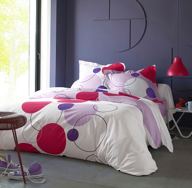 Envie de buller au lit ? Cette parure est faite pour vous ! Affichant de grands et petits motifs ronds dans des nuances de prune, mauve et rouge ce linge de lit 100 % coton mise sur un look empreint de simplicité et de douceur. Bulles coton Colombine : Housse de couette : à partir de 29,99 € Drap plat à partir de 17,99 € chez Blancheporte .