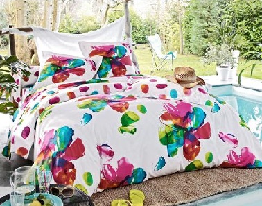 Ce linge de lit coloré comme un tableau à l’aquarelle est prêt à faire chanter les couleurs d’une chambre adulte ! Sur un fond blanc, les couleurs multiple forment à la fois des fleurs irréelles et paradisiaques et de gros pois élégants. Housse de couette à partir de 34,93 €, Drap plat à partir de 24,43 €, Taie d’oreiller 13,93 € Linge de maison by Becquet aux 3 Suisses.