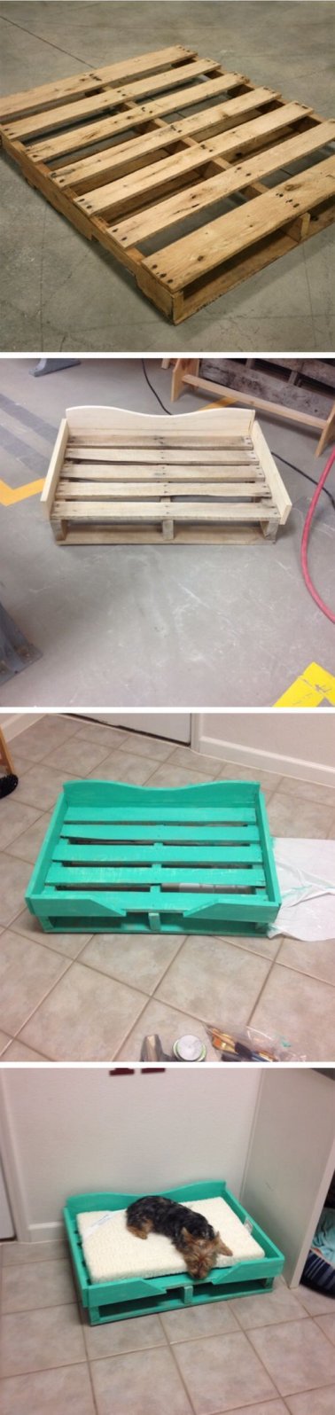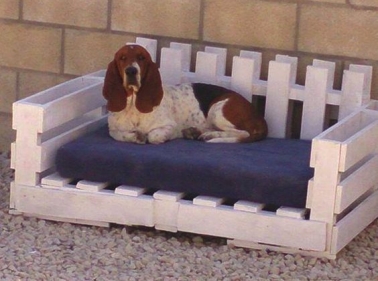 Déterminez les dimensions du lit en fonction de la taille du chien . Sélectionnez quatre traverses dans une palette de la bonne longueur, quatre autres pour la largeur et quatre pieds. Montez le tout comme sur la photo, et fixez avec des vis. Pour le plateau, démontez une autre palette et sciez les traverses dans le sens de la longueur afin de réaliser des baguettes ou plus facile encore fixez une plaque de contreplaqué. Formez un cadre que vous clouerez sur le dessus de la plaque.