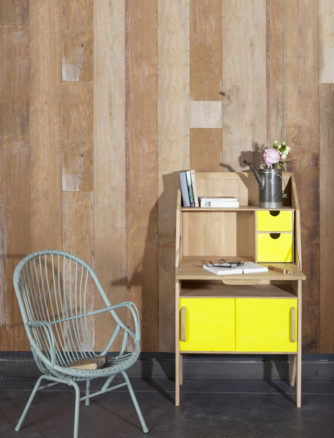 Un meuble secrétaire qui prouve combien le style vintage s’intègre dans nos intérieurs modernes ! Structure en chêne massif, couleur des façades disponible en jaune, noir et blanc. Dim : L70cm x P35cm x H130cm 745€.