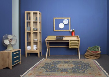 Un aménagement de bureau qui a du caractère avec ses meubles en bois naturel sur des murs bleu. Meuble bureau Structure en chêne massif, panneaux de fibres à densité moyenne Origami DESK 898 €. Commode 3 tiroirs dim : L42cm x P35cm x H50cm. Réf : Origami NIGHtstand, 3 couleurs disponibles pour les tiroirs : blanc noir bleu 296 €. Bibliothèque L60CM P 30XH200cm dim : Réf : Etagère Pirouette Bookrack 898 €.