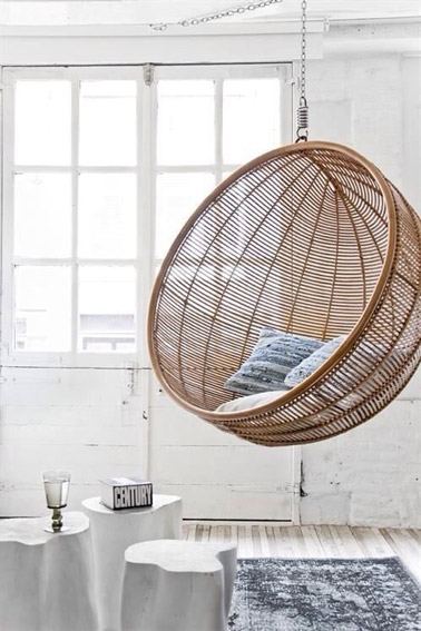 Cosy à souhait, ce salon ultra lumineux s’accorde une touche d’originalité avec un élégant fauteuil suspendu en rotin ! Un petit cocon où s’installer avec des coussins, idéal pour se balancer, bouquiner et se reposer tranquillement et sans soucis !