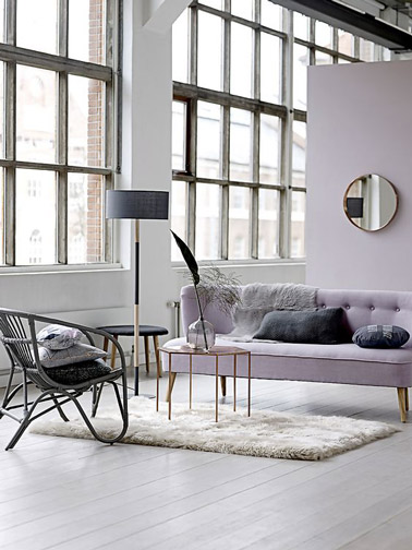 Atmosphère douce et lumineuse dans le salon grâce à la couleur parme combinée à un joli parquet blanchi où un tapis douillet trouve sa place. Le mobilier tendance se marie judicieusement au fauteuil en rotin noir pour une déco fraiche et chic. Fauteuil brother rotin noir Bloomingville, 320€, The Cool Republic