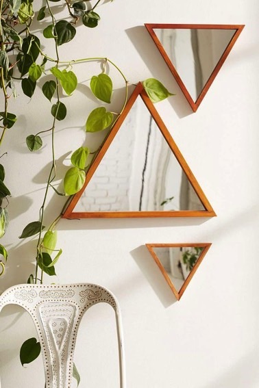 Des petits miroirs triangles en bois accrochés au mur font la déco