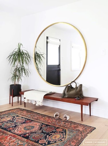 Voilà une astuce déco pour donner l’impression que la pièce est plus grande simplement grâce à un miroir ! Ici, le hall d’entrée ultra lumineux adopte un grand miroir rond à bord doré qui ne manque pas de donner plus de profondeur à l’espace.