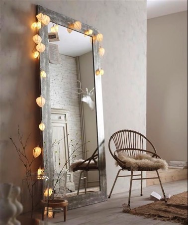 Déco scandinave avec un miroir encadré d’une guirlande lumineuse