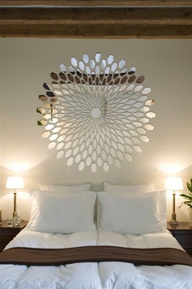 Voilà la preuve que des fragmentes de miroirs peuvent donner un style unique à une pièce ! Disposés de façon à créer une fleur juste au dessus du lit, cette chambre parentale a un charme incontestable dynamisé par des morceaux de miroirs.