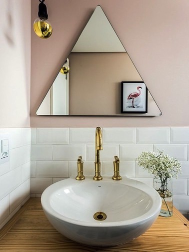 Dans cette salle de bain aux touches dorées qui adopte le carrelage métro blanc combiné à une peinture rose pale sur les murs, un lavabo vintage posé sur un plan de travail en bois, pour finir le miroir original en forme de triangle trouve sa place tout naturellement !