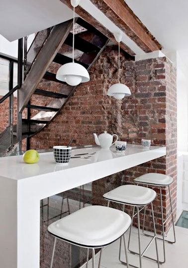 Un mur de brique sous un escalier se transforme en petit espace repas. Une solution gain de place adaptée ici autour d’un mobilier de cuisine blanc pour sublimer l’aspect brut du mur.