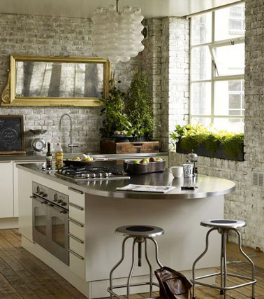 Les murs en brique presque blanches participent au mix de déco industrielle et campagne de cette cuisine américaine. Le plan de travail de l’îlot central en acier brossé et les tabourets de bar coordonnés installent l’ambiance loft de la pièce. Tandis que le miroir chiné doré à la feuille d’or et le luminaire en verre soufflé insufflent leurs notes rétro.
