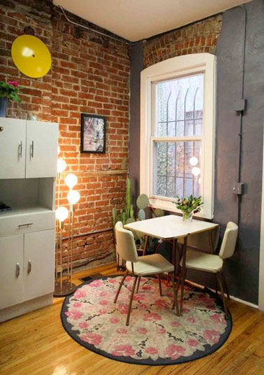 Conserver un seul pan de mur en brique donne de l’authenticité à la déco de cette cuisine. Tapis de sol, luminaires et horloge rétro signent à leur tour le look old school de la pièce.