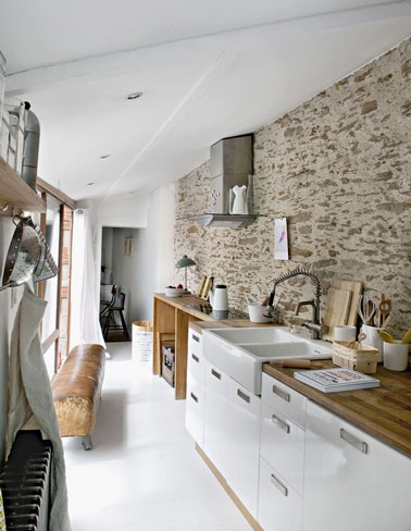 La déco naturelle de cette cuisine en longueur est composée grâce à mur de pierre et de brique. Cheval d'arçon rétro, accessoires de cuisine et caisses en bois soulignent la simplicité des lieux