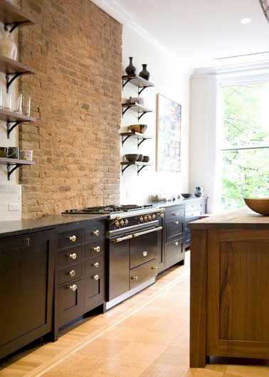 Habituellement associé à l’esprit loft, un mur de brique saura sans conteste faire le bonheur des amateurs de cuisine industrielle surtout si elles sont peintes en noir et associées à des meubles de cuisine laqué blanc pour lui donner une allure encore plus design.