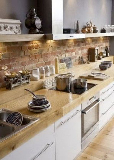 Cette cuisine de campagne mise sur un mur en brique rose et beige pour faire la déco de sa crédence. Le mur a été piqué pour laisser apparentes ces belles briques anciennes qui se fondent dans le décor de la pièce et s’associent au plan de travail en bois blond. Pour compléter l’allure de la cuisine, des petits objets en cuivre et en étain s’exposent sur les étagères posées près de la hotte.