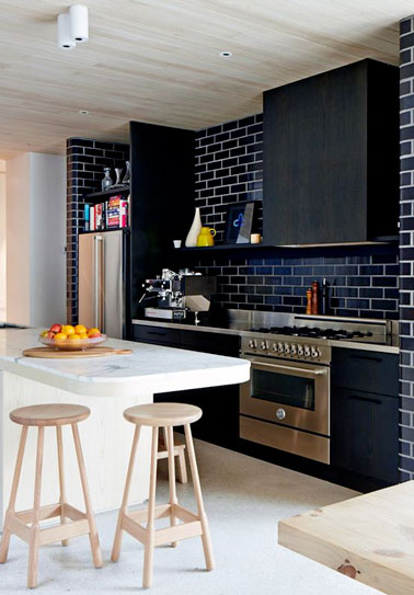 Cette cuisine moderne est agencée à l’aide d’un mur de crédence en brique noir souligné de joints blancs pour renforcer son allure graphique. Les façades des meubles de cuisine hauts et bas repeintes en noir elles aussi révèlent à leur tour l’éclat du plan de travail et de l’électroménager en inox. L’îlot central joue les contrastes de couleurs avec son plan de travail en marbre blanc et ses tabourets de bar en bois blond.