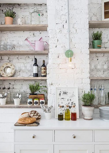 Pour assortir les murs aux meubles de cuisine, une couche de peinture acrylique blanche est appliquée au rouleau sur le mur en brique de cette cuisine. La pièce est ensuite colorée en posant  des touches de couleurs sur les étagères décorées de plantes aromatiques, un arrosoir de jardin rose pastel et . Une suspension verte et des accessoires de cuisine complètent la palette.