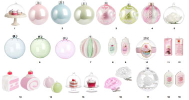 1-ClocheCUPCAKE-Haut10cmxØ8cm-6,90€-2 BoulesOPALINE-Ø7cm-1,30€-3BoulesCHANTILLY-Ø8cm-2,90€-4BouleARABESQUE-Ø8cm-2,90€-5BouleFLEUR-Ø7cm – 2,90€ – 6 Boules translucides GUIMAUVE – Ø 8cm – 1,50€ – 7 Boule BERLINGOT – Ø 8cm – 3,50€ – 8 & 9 Médaillons SALON DE THÉ- Haut 13cm x Larg 7cm – 3,90€ – 10 Boule CUPCAKE – Ø 8cm – 2,50€ – 11 & 12 Médaillons MACARON – Haut 12cm x Larg 5cm – 3,50€ – 13 Suspensions PART DE GÂTEAU – Haut 7cm x Ø 6cm – 2,50€ – 14 Suspensions MACARON – Ø 4cm – 1,80€ – 15 Cloches CUP CAKE – Haut 7cm x Ø 5cm – 2,90€ – 16 Pinces ROSE – x Ø 5cm – 2,50€ – 17 Boule BRODERIE – Ø 10cm – 4,50€ – 18 & 19 Plaques PISTACHE ET FRAMBOISE – Haut 10cm x Larg 7cm – 1,20€.