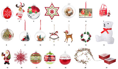 1 Boule FLOCON – Ø 8cm – 2,90€ – 2 Suspension RENNE – Haut 15cm x Larg 7cm – 4,90€ – 3 Boule BONHOMME DE NEIGE – Ø 10cm – 6,90€ – 4 Suspension ETOILE – Haut 13cm x Ø 11cm – 3,50€ – 5 Boule SAINT NICOLAS – Ø 10cm – 3,50€ – 6 Plaque CARTE POSTALE – Larg 9cm x Haut 6cm – 1,20€ – 7 Suspension SAC – Larg 5cm x Haut 6cm – 1,50€ – 8 Médaillon loupe SAPIN – Ø 9cm – 4,50€ – 9 & 10 Boules SAPIN & BAMBI – Ø 8cm – 3,90€ – 11 Suspension CHEVAL A BASCULE – Larg 8cm – 1,90€ – 12 Suspension FAON – Haut 9cm – 4,90€ – 13 Suspension GRELOT – Ø 8cm – 3,50€ – 14 OURS LUMINEUX – Larg 20cm x Prof 26cm x Haut 25cm – 34,90€ – 15 Suspension PÈRE NOËL – Haut 7cm x Ø 4cm – 3,50€ – 16 Suspension FLOCON – Larg 12cm x Haut 14cm – 3,50€ – 17 Boule GRAPHIC – Ø 8cm – 3,90€ – 18 Boule CHRISTMAS – Ø 8cm – 3,90€ – 19 Boule DIABOLO – Ø 7cm – 2,90€ – 20 Guirlande MONTAGNE – Long 100cm – 14,90€ – 21 Boîtes en métal NOEL – Long 8cm x Haut 4cm – 3,90€ l’unité.