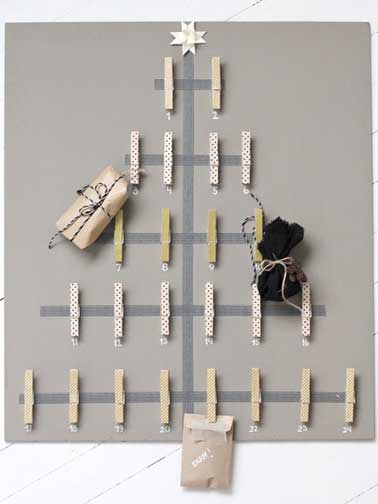 Puisqu’un sapin de Noël sans étoile, même sur un calendrier n’est pas un vrai sapin, récupérez ou acheter une étoile en papier dans une couleur naturelle pour s’harmoniser avec les tons de bois clair et gratifiez-la d’un petit point de colle.