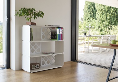 Comme un jeu de cubes qu’on empile, ces étagères s’emboîtent les unes avec les autres de manière à créer un grand meuble en longueur aussi bien qu’un meuble étagères montant jusqu’au plafond. S’adaptant aux besoins et au lieu de vie où il est disposé, ce meuble étagères peut également servir de cloison amovible pour séparer une pièce et optimiser l’espace.