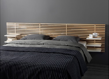 Coup de coeur du jour de Déco Cool pour une tête de lit au design épuré composée de lames de bois et de tables de chevet ajustables d'Ikea
