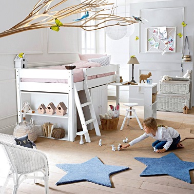 Si les grands ont leur mezzanine gain de place, les petits ont leur lit combiné ! Fonctionnel et mignon, ce lit en hauteur dispose d'étagères de rangement et d'un bureau.