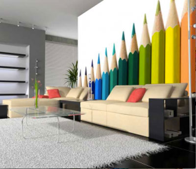 Ici, ce mur d’image aux Empreintes de mains d’enfants est l’élément de décoration majeur du salon. Le jeu des mains et leurs couleurs s’opposent aux verticales et horizontales formées par les lignes des canapés, tapis, table et plante et crée un heureux équilibre dans le salon. Le fond blanc du papier, telle une fenêtre, apporte une source de lumière intéressante dans la pièce