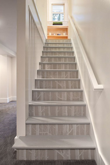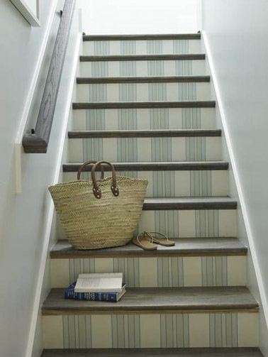 Des contremarches d’escaliers colorées grâce à des lés de papier peint