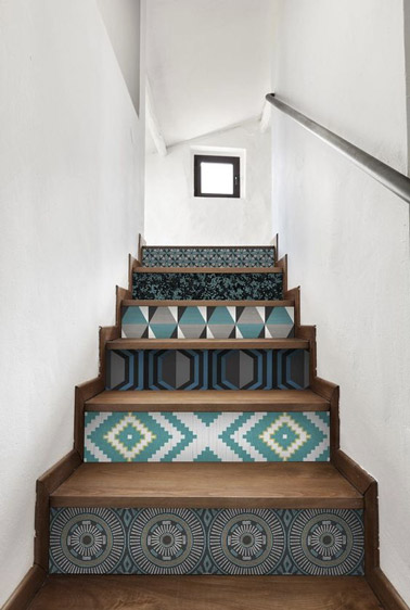 Dans un escalier sobre, rien de mieux que de relever la déco avec du papier peint sur les contremarches ! Ici les motifs géométriques colorés sont à l'honneur !