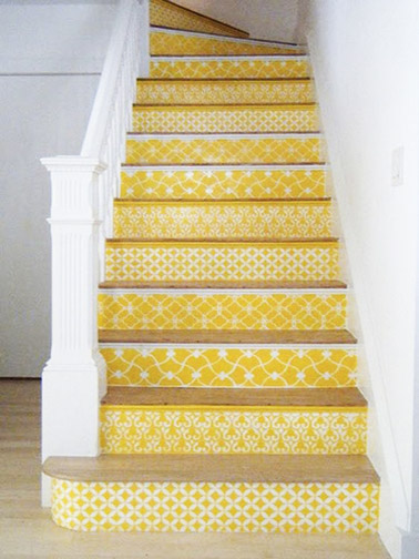 Pour égayer les contremarches des escaliers voilà un papier peint jaune à motif blanc qui fera parfaitement l'affaire et qui apportera bonne humeur et harmonie