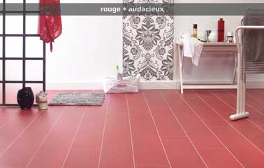 Déco contemporaine avec ce parquet salle de bain contrecollé . Teinté en rouge vif, il dynamise les murs blancs et impose son caractère dans la pièce. Parquet contrecollé en chêne teinté rouge vif, finition huilée, prix sur demande. Parquet Français